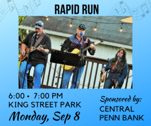 Join us for our final – and rescheduled – Music in the Park concert with Rapid Run! Please note the 6pm start time instead of the usual 7pm!